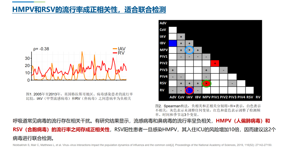 研究還發(fā)現(xiàn)RSV與hMPV的流行呈正相關(guān),一項(xiàng)基于9年間44230例呼吸道疾病診斷數(shù)據(jù)的分析顯示[1]:RSV與hMPV的流行呈正相關(guān),適合聯(lián)合檢測,RSV和HMPV的混合感染會(huì)帶來更嚴(yán)重的疾病結(jié)果,因而建議這2個(gè)病毒進(jìn)行聯(lián)合檢測,這有助于更精準(zhǔn)地識(shí)別病原,為臨床診療提供重要依據(jù)。綜上,hMPV混合感染普遍存在,且與RSV流行密切相關(guān),聯(lián)合檢測二者可提升病原識(shí)別效率,對(duì)規(guī)范診療、避免抗菌藥物濫用具有重要意義。