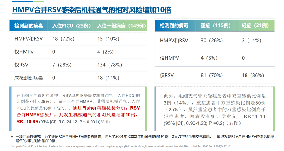 一項(xiàng)納入191例2歲以下住院患者的研究顯示:hMPV與RSV合并感染后,機(jī)械通氣的相對(duì)風(fēng)險(xiǎn)增加10倍[2]。