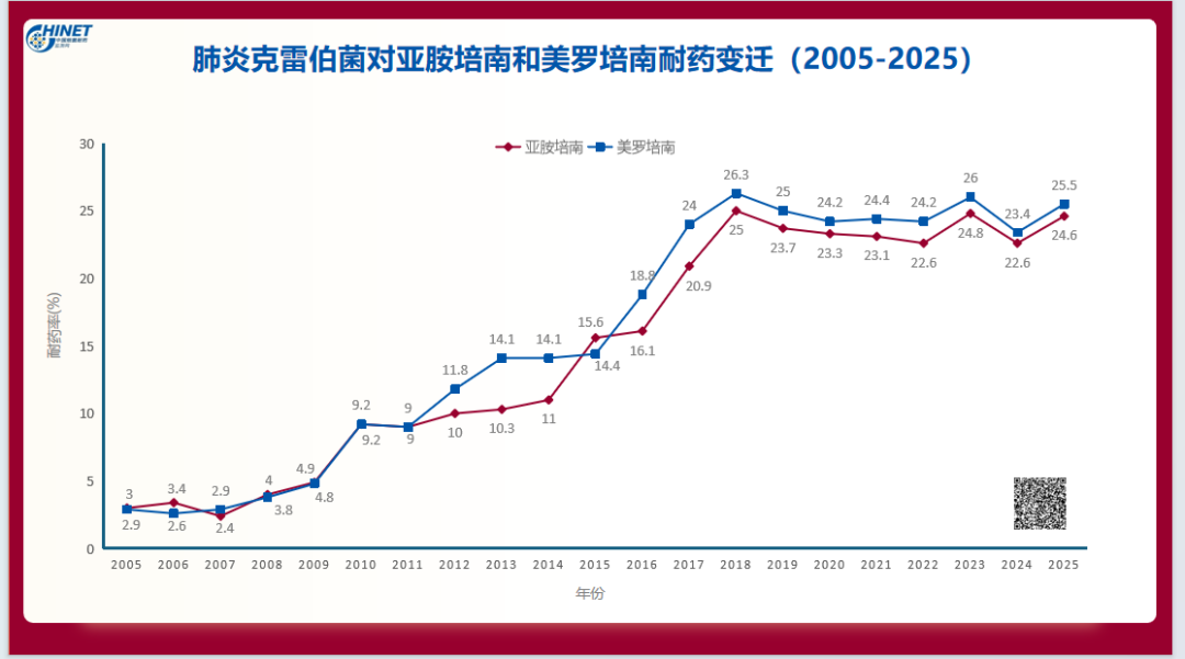 圖1:CHINET主動(dòng)監(jiān)測(cè)數(shù)據(jù):肺炎克雷伯菌對(duì)亞胺培南和美羅培南耐藥變遷(2005-2025)