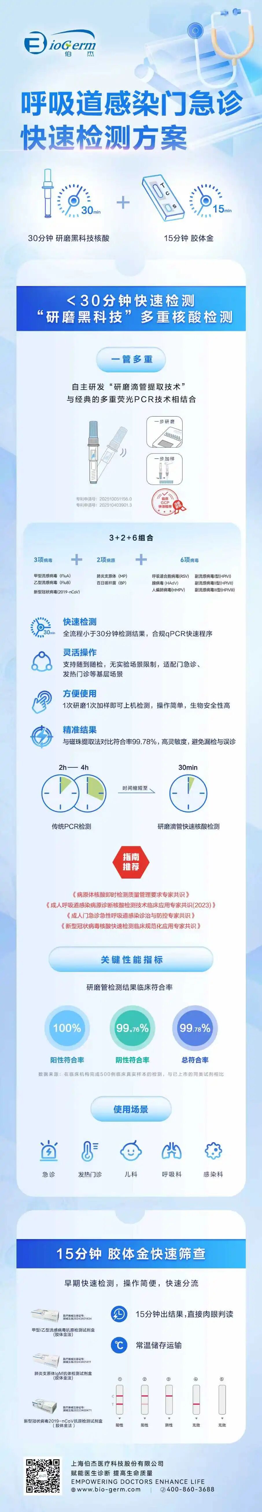 伯杰醫(yī)療門急診核酸快速檢測方案,采用先進的熒光定量PCR技術,具有靈敏度高、特異性強、操作簡便等優(yōu)點。可提供甲乙流、肺支、百日咳;以及呼吸道常見病毒的呼吸道病毒六項檢測試劑盒,在檢測偏肺病毒、合胞病毒同時包含腺病毒(HAdV)、副流感病毒(PIVⅠ、Ⅱ、Ⅲ型),覆蓋CDC監(jiān)測的重要致病原。搭配近期新推出的研磨管黑科技,30分鐘出結果,助力門急診快速早篩方案,有研究顯示:使用快速多重PCR精準診斷可減少住院時間0.82天?此外,另有甲型/乙型流感病毒抗原檢測試劑盒(膠體金法)操作簡便快捷,僅需1分鐘即可完成檢測,15分鐘內(nèi)提供結果。成為門、急診病原體篩查的得力助手,幫助醫(yī)療機構更高效地分流患者,顯著提升整體診療效率與服務質(zhì)量。