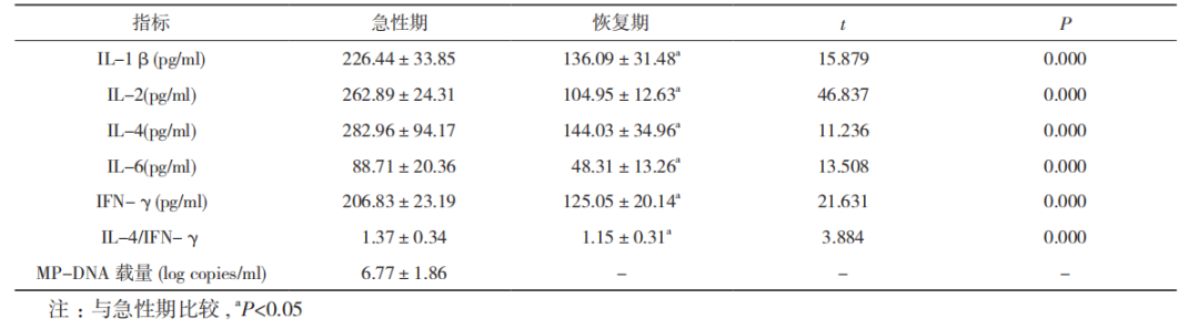 SMPP組患兒急性期與恢復(fù)期炎癥細(xì)胞因子水平比較,SMPP組患兒恢復(fù)期 IL-1β、IL-2、IL-4、IL-6、IFN-γ 和 IL-4/IFN-γ 均明顯低于急性期, 差異具有統(tǒng)計(jì)學(xué)意義 (P<0.05)。(表2)這表明細(xì)胞因子表達(dá)情況與病情轉(zhuǎn)歸等均有一定關(guān)系 , 因此細(xì)胞因子檢測(cè)可為臨床評(píng)估病情和治療干預(yù)提供了一定的理論依據(jù)。
