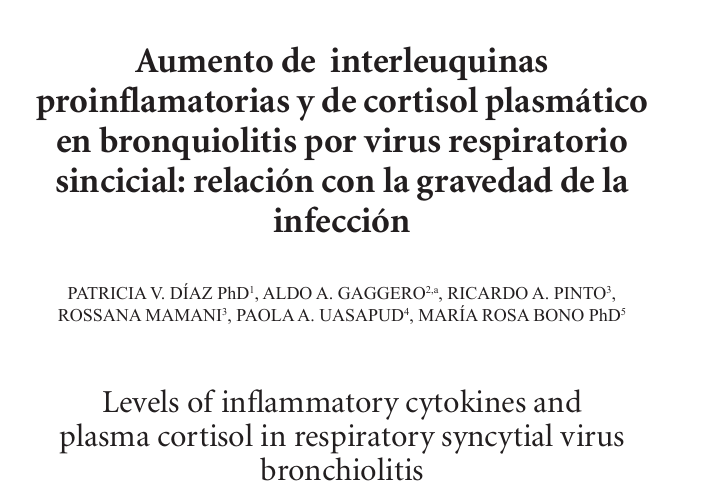 3.Díaz PV, Gaggero AA, Pinto RA, Mamani R, Uasapud PA, Bono MR. Levels of inflammatory cytokines and plasma cortisol in respiratory syncytial virus bronchiolitis. Rev Med Chil. 2013;141(5):585-591.
